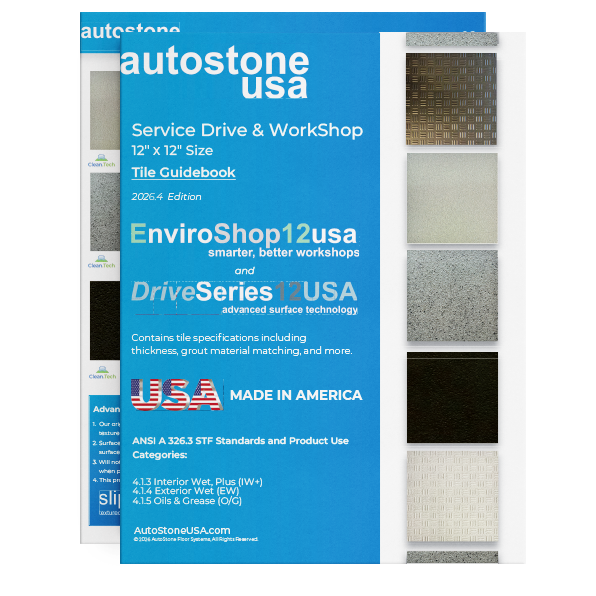 AutoStone service drive and workshop tiles are manufactured with our brightfinish to resist rubber-transfer, and surface stains. While other tile manufacturers state that their tile will “naturally patina” over time, our workshop tiles can be kept clean and “like-new” with regularly scheduled and proper cleaning maintenance. AutoStone service and workshop floor systems are designed for the automotive service model marketplace.